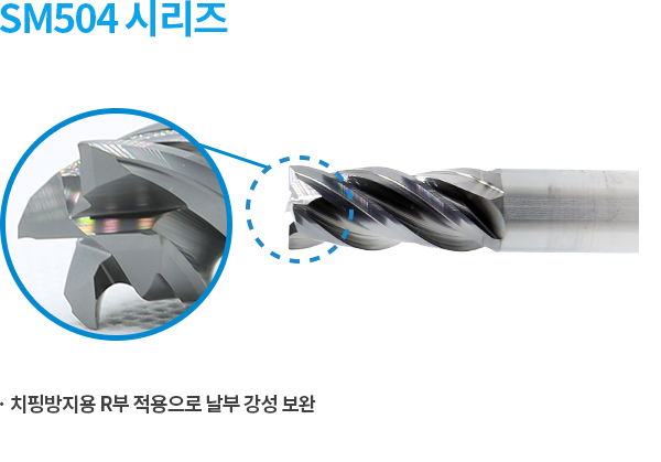 - 고온경도가 높은 소재 적용으로 내마모성, 돌발파손 최소화 - TiAlN+SH 코팅 적용으로 높은 표면경도, 내용착성 - 부등분할 인선 형상 적용으로 높은 칩 배출력, 진동 감소