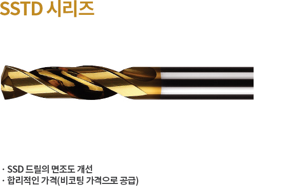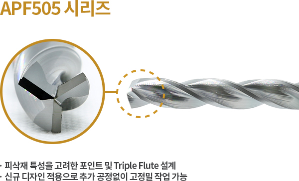 - 고인성 미립 소재 적용으로 높은 내치핑성 - TiN, DLC 등 코팅 적용으로 날부 강성 향상, 탁월한 칩 배출력 - 날경 = 자루경 타입의 규격 채택으로 고객의 선택 폭 확대
