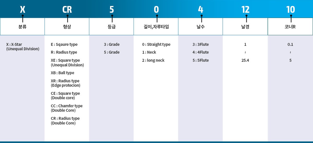 5날, 부등분 분할 표준길이 코너 래디우스 타입 + |