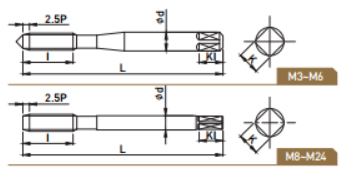• 막힌 구멍 가공용으로 탄소강, 합금강 및 비철금속 가공에 있어 절삭칩 배출에 탁월한 홈 형상을 적용